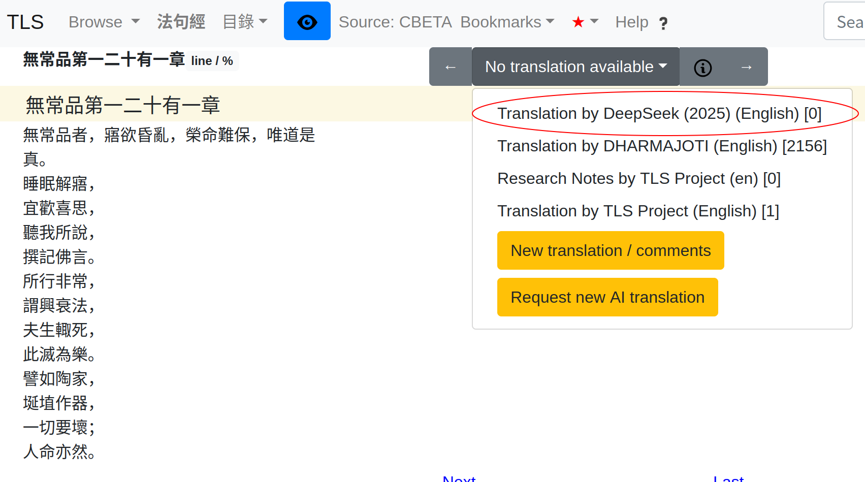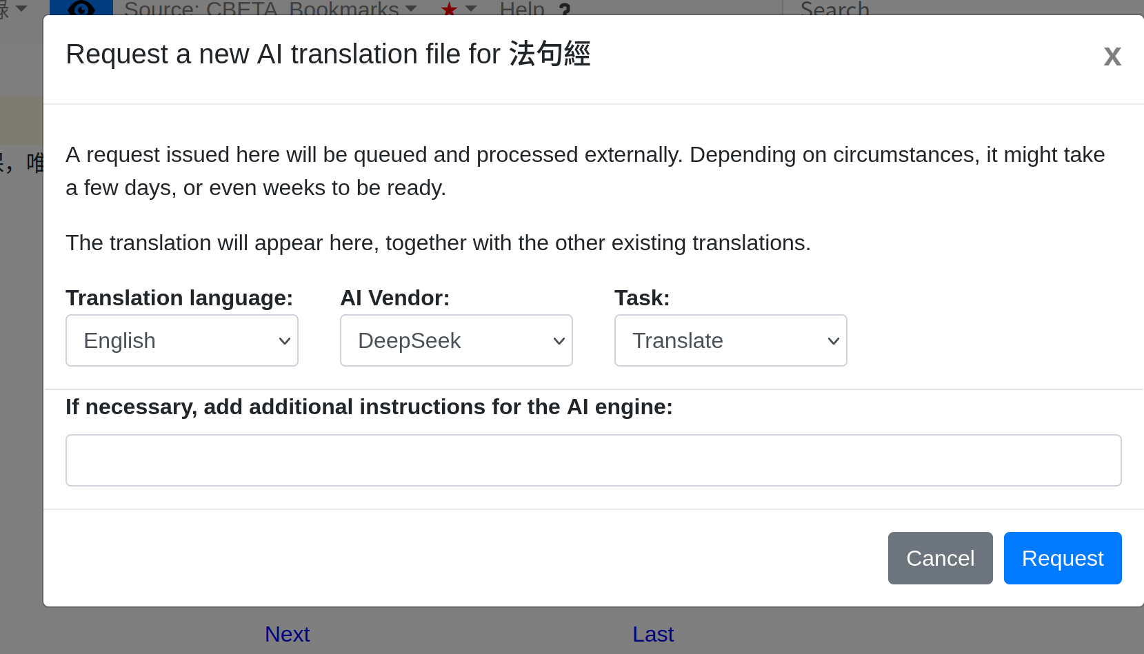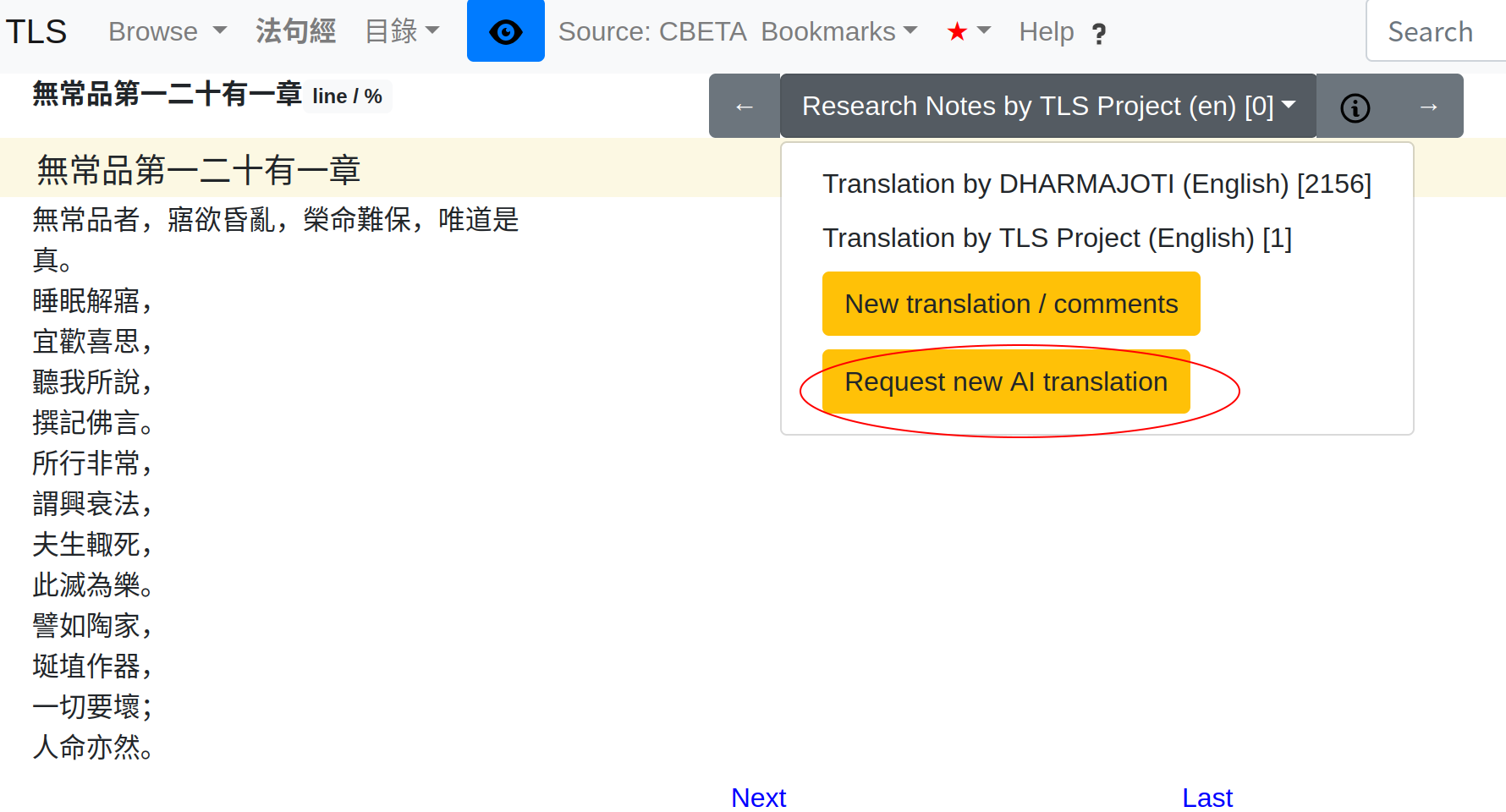 The section Translation draft from AI describes how to set up a translation file that can be used interactively. When we introduced AI translations, this was the only way to get AI translations, which will be pulled from Gemini. This will basically translate the page you are currently looking at and paste it on the screen. The assumption here was that a user finds a passage in an unfamiliar text, most likely through a search, and would like to quickly understand what is being said. Since AI engines might give unexpected results (or no results), a user might have to repeat the request a few times until the result is satisfying.